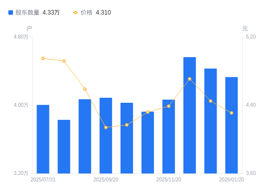 日期A股户数(户)流通A股户均持股数(股)户均持股市值(万元)2026-01-204330556092.2824.182025-12-204431554813.8624.392025-12-104564953212.0425.062025-11-204065659747.0526.232025-10-203925661877.8326.732025-09-304029860277.8425.142025-09-204088359415.3124.602025-08-204070059682.4627.392025-08-103828763443.8931.212025-07-314003760670.7930.03
