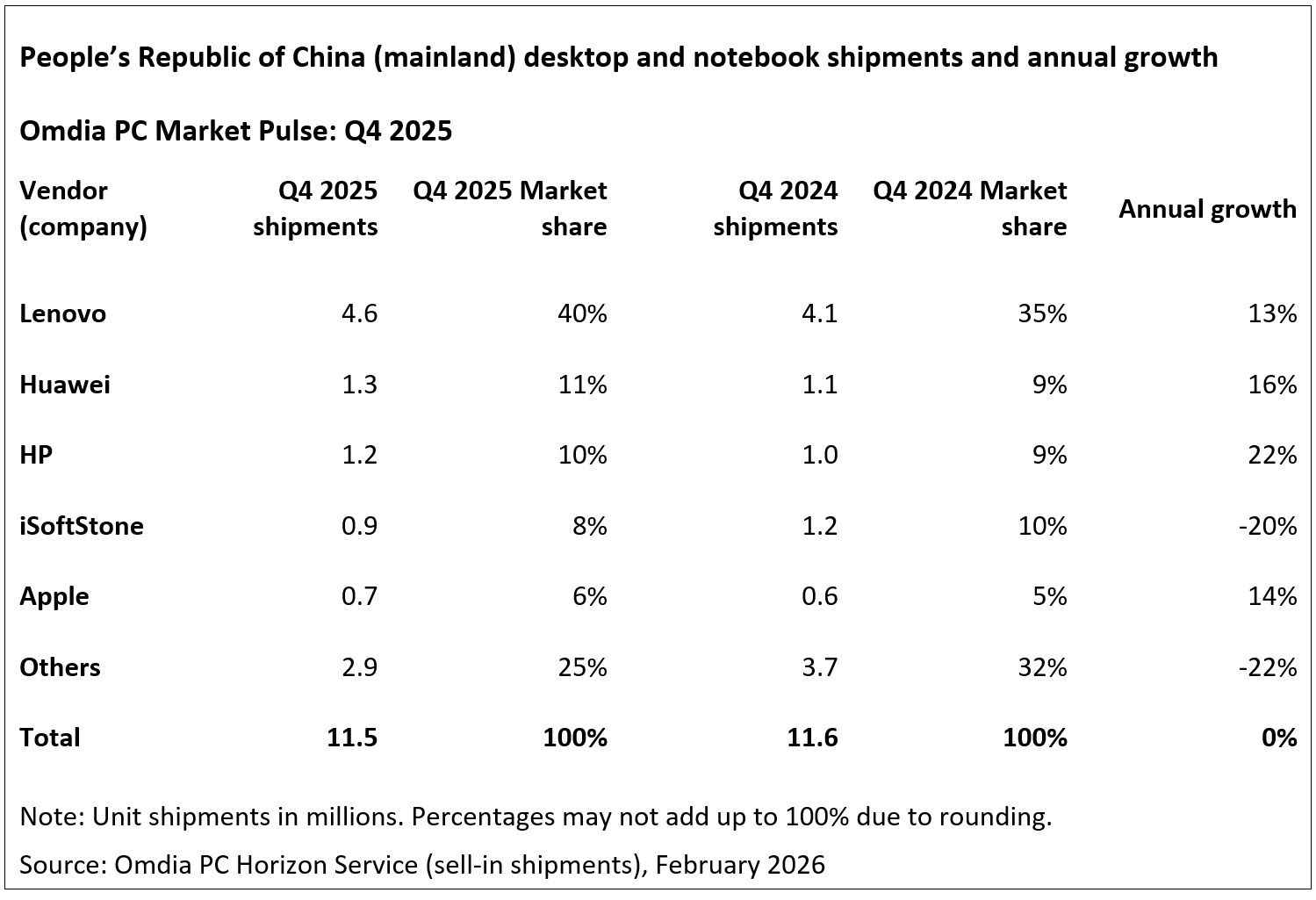 2025年第四季度中国大陆PC出货量Omida